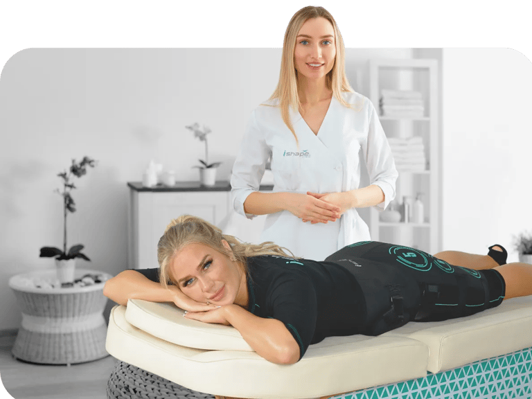 Uma sessão de i-Shape Esthetic, trabalha diretamente nos grupos musculares gerando contrações, superficiais e profundas, fazendo o músculo contrair, aumentando assim a atividade metabólica.
